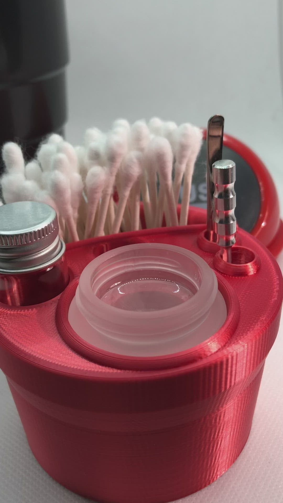 This Cupholder Station discreetly holds everything you need to dab while still taking care of the trash! Features ample Q-Tip storage, 2 Dabber Slots or a Hot Knife Slot, a Wax Dish (Included!), and an Iso Vial (Included!). Also featuring a Dirty Q-Tip trash chute to the bottom, allowing for quick disposal!